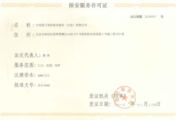 中保國衛(wèi)國際保安服務(北京)有限公司,屬中保國衛(wèi)集團旗下子公司。能全方位的為大型客戶提供優(yōu)質(zhì)的安保、押運服務,是集人防和技防于一體的新型正規(guī)化綜合安保押運服務企業(yè),提供人防、物防、技防、聯(lián)網(wǎng)報*、非武裝押運等安防相關(guān)的一站式服務。 公司在國內(nèi)多省設立有分公司及分支機構(gòu),著重提升安全押運、智能技術(shù)押運及安全技術(shù)防范相關(guān)的服務,業(yè)務范圍覆蓋全國一、二線城市、港澳地區(qū)以及海外地區(qū)。安保方面主要為政府機構(gòu)、金融機構(gòu)、企事業(yè)單位、醫(yī)療衛(wèi)生、高等院校、工業(yè)園區(qū)、大型商場、高檔住宅、智能商務樓、大型活動提供門衛(wèi)、守護、巡邏、押運(非武裝)、安全檢查、保安特勤、私人護衛(wèi)、消防中控、安全技術(shù)防范、遠洋護航等全方位服務,同時面向國際市場,為中資企業(yè)在“一帶一路”沿線國家投資提供境外安保服務。 >> 更多內(nèi)容 |